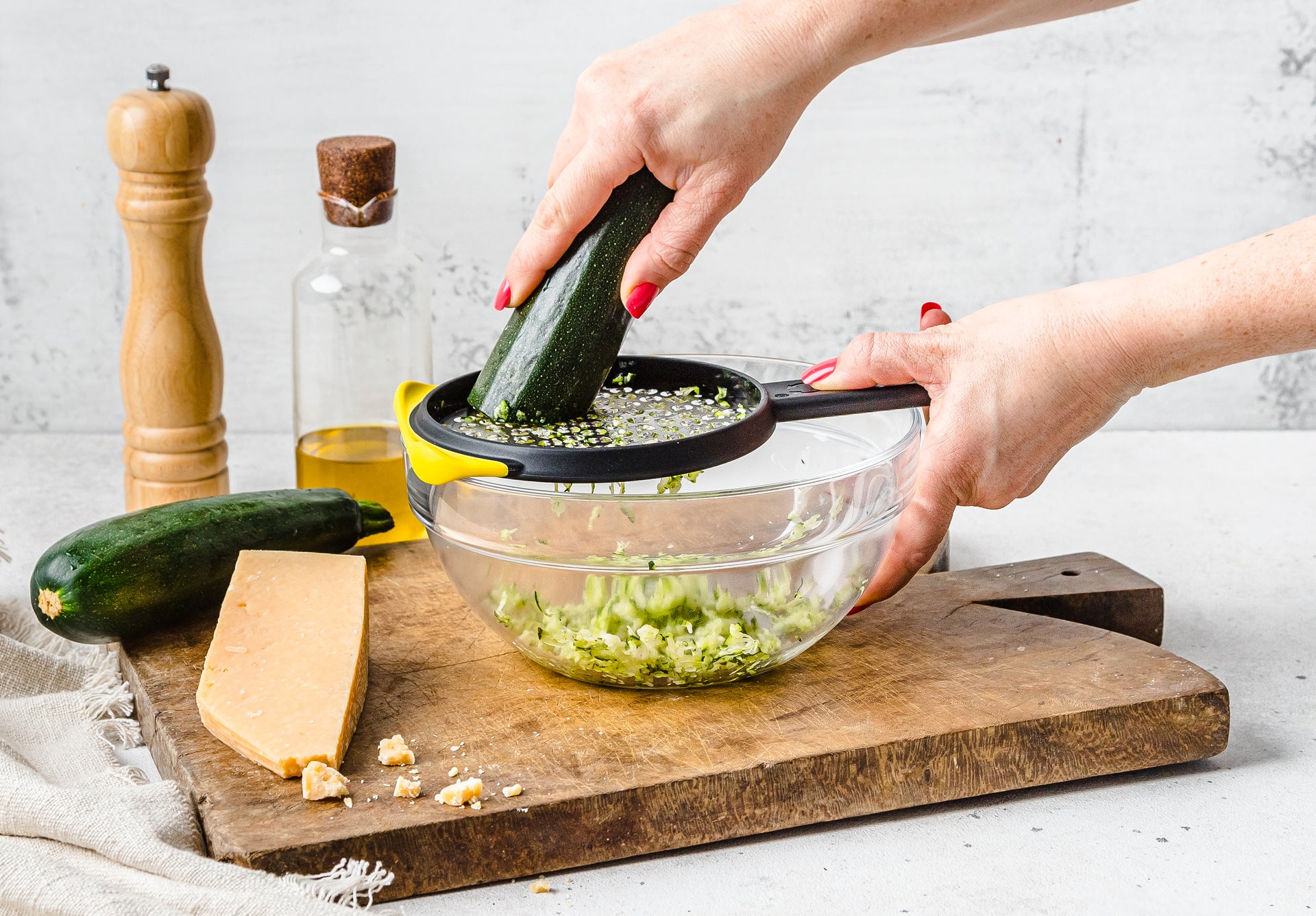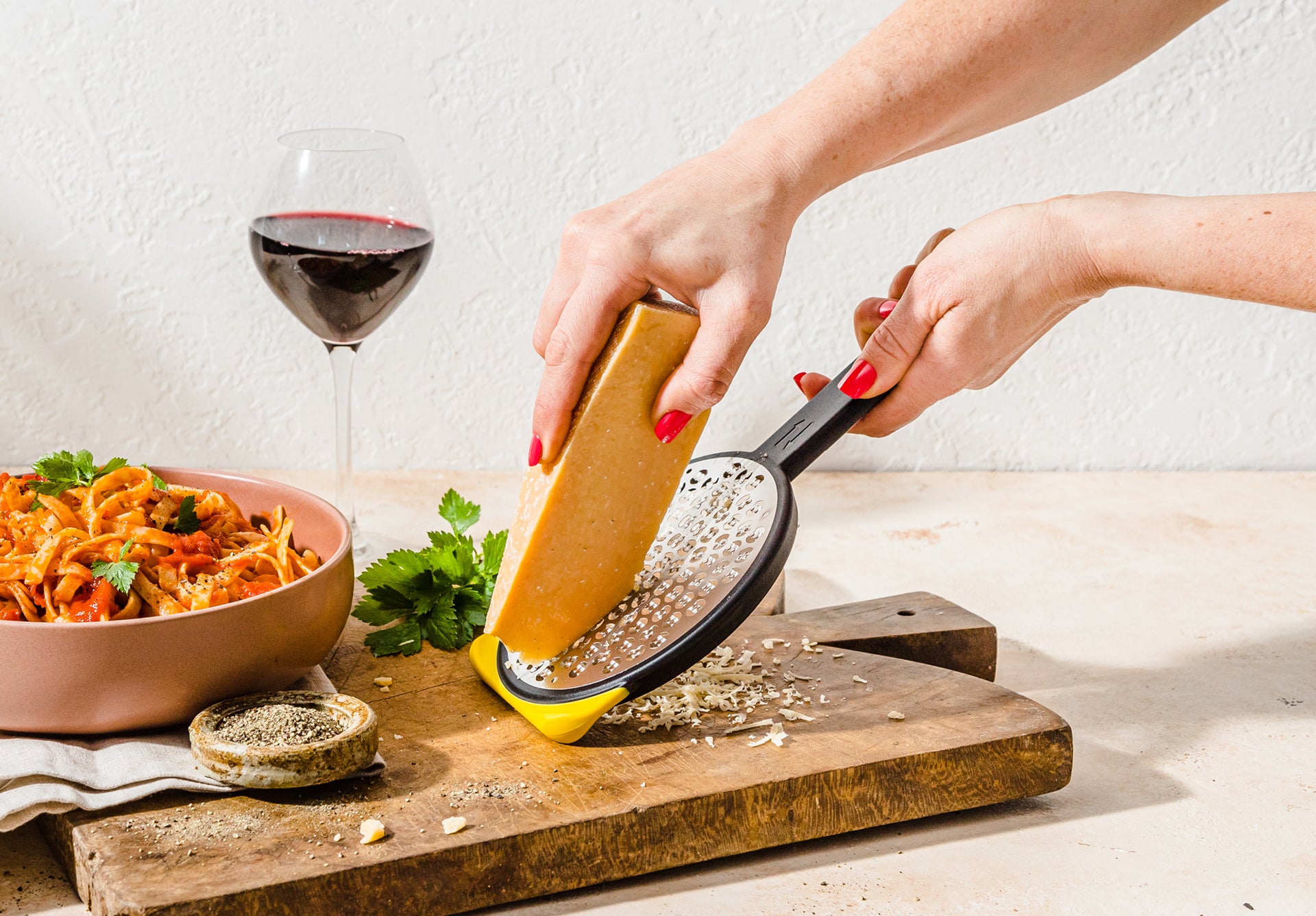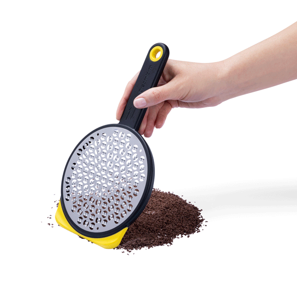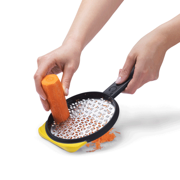 Ograte is a two-sided speed grater that continuously works in a circular motion on one side, and an up and down motion on the other. Bottom side blades grate in a circular motion for speed grating foods like carrot and zucchini, and includes a guide rim for easy grating in either direction. Top side blades grate in both an up and down motion for efficient grating, and features an extra-wide plane for large foods like cheese. Non-slip foot provides control while grating on flat surfaces, doubles as a scraper, and also hooks on to the edge of a bowl. Unique safety cover securely snaps on to protect both sides of the razor-sharp blades for worry-free storage in a drawer.