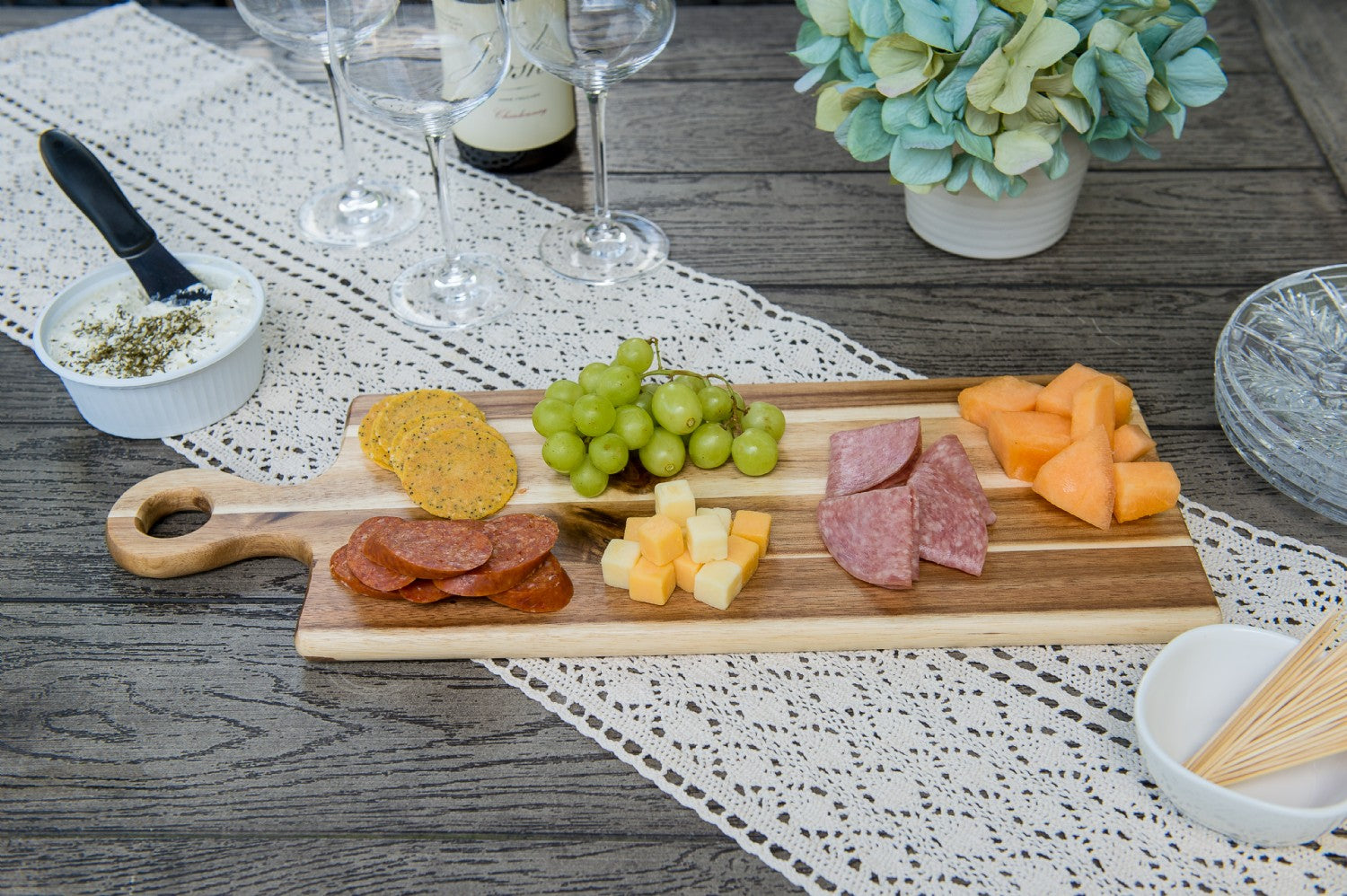- Can be used as a cutting board and a serving board.
