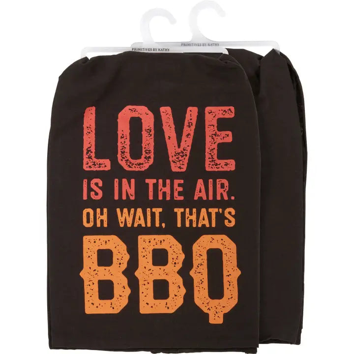 A black cotton kitchen towel from our Grilling and Chilling Collection displaying a humorous "Love Is In The Air. Oh Wait, That's BBQ." sentiment with distressed details. Our Love Is In The Air kitchen towel is machine-washable for convenient cleaning.