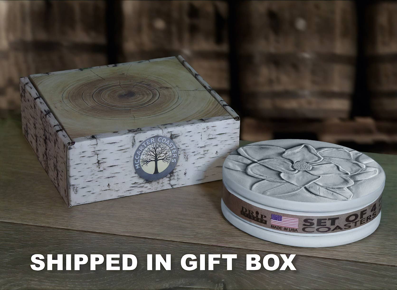 McCarter Coasters naturally absorb moisture while the cork feet protect your furniture. All the moisture disappears and the coaster will never stick to your glass. The fine textured detail is embossed giving them dimension, and the natural color goes with any decor.