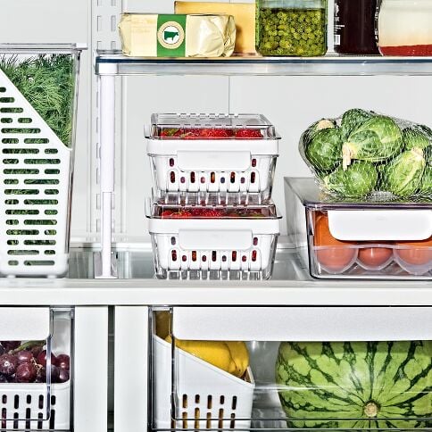 The OXO Produce Savers are fridge-friendly storage bins designed to keep your produce fresh longer. The Berry Keeper is designed to create the optimum environment for smaller items that often get lost in crispers like strawberries, blueberries and cherry tomatoes. These stackable bins with clear lids keep produce organized and visible, which helps reduce food waste – no more finding a forgotten rotten veggie in the back of the fridge. The inner basket keeps berries elevated and promotes optimal air circulation to keep things fresh, and the basket is removable so you can use it to rinse or serve berries. The inner removable basket is convenient for cleaning or food prep – just wash your berries, sort them, then put them back in the bin or fridge – no need for a separate colander. The bin’s comfortable handle makes it easy to take the bin to the counter. This two-piece set is BPA-free and dishwasher safe and coordinates with other OXO Produce Savers for modular, customizable organization.