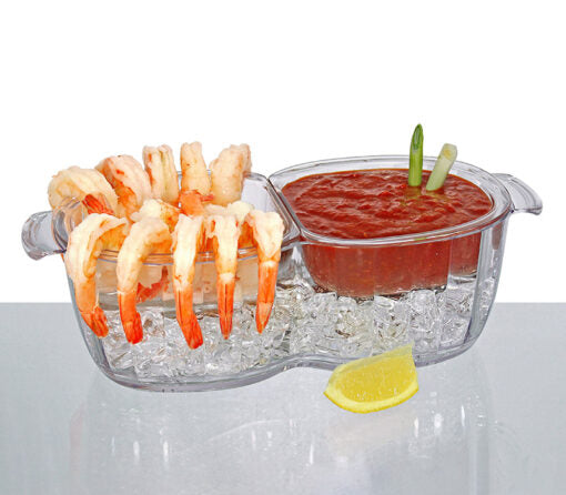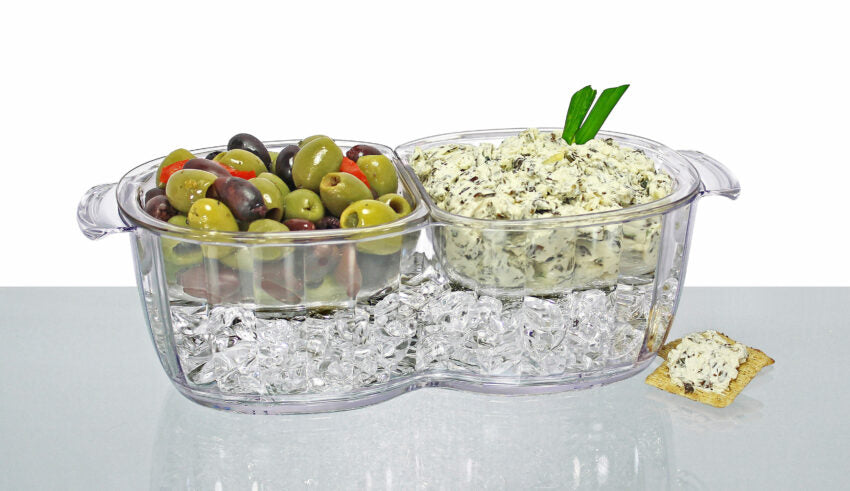 Start the party with this entertaining must. Two individual dip bowls (16 oz. ea.) nest inside lower ribbed wall ice tray. Place cubed or crushed ice into ice tray and position dip bowls so they make good contact with ice. Ice can easily be replaced as needed. Dips, condiments and more stay chilled and fresh for hours. Convenient carrying handles and non-skid feet. The 3 part set is BPA free SAN polymer. Measures 12 ½” × 5 ¾” × 3 ¾”H.