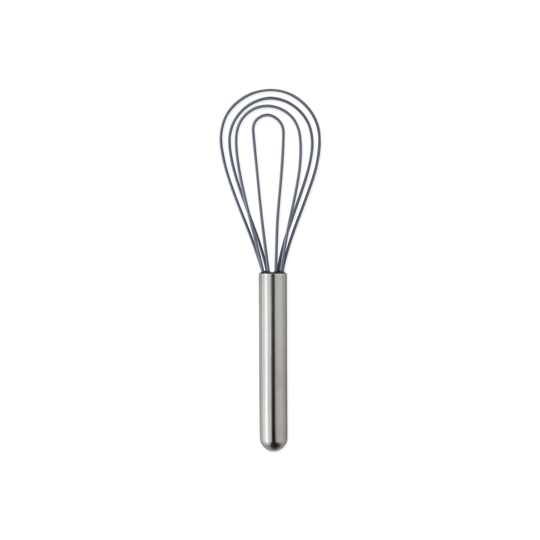 • Flat Silicone Whisk measures 9.75 inches in length with a width of 2.75 inches. Designed with four silicone coated 18/8 grade stainless steel durable curved wire tines.