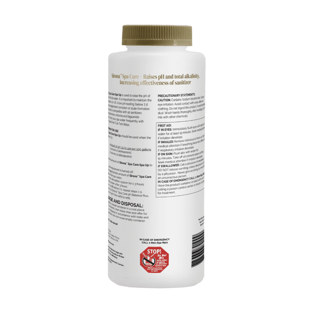 Make sure your spa water remains as safe and healthy as can be with Sirona™ Spa Up. The granular formula of our spa alkalinity increaser raises the pH and total alkalinity levels in hot water to increase the effectiveness of your sanitizer as well as reduce the chance of equipment corrosion.