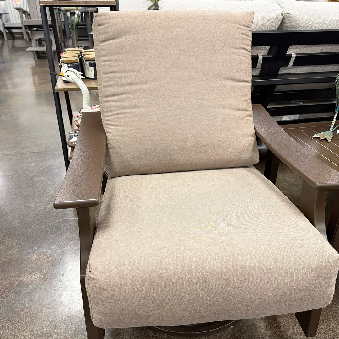 The St. Catherine Swivel Rocker blends timeless style with the long-lasting performance Telescope Casual is known for. Stocked in a rich Kona Marine Grade Polymer (MGP) frame, this chair is built to withstand sun, humidity, and everyday outdoor use without fading, cracking, or peeling. The Sunbrella Play Mocha cushions add a soft, inviting texture and exceptional comfort, perfect for relaxing on the patio. A smooth swivel and gentle rocking motion make this chair a favorite for conversation, morning coffee, or unwinding at the end of the day. Backed by a 15-year MGP frame warranty and proudly made in the USA, it’s a piece designed for years of dependable enjoyment. For a personalized look, the St. Catherine Swivel Rocker is available to special order in a wide range of MGP frame colors and Sunbrella fabric options.