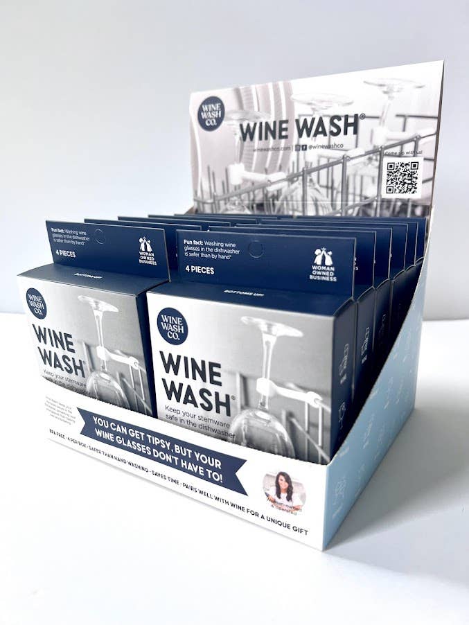 With Wine Wash®, you can get tipsy, but now your wine glasses don't have to! Wine Wash® helps keep those wine glasses upright, even when you’re not. Properly secure your dishwasher safe stemware with Wine Wash®, run the dishwasher and voila: sparkling clean wine glasses. Less time hand washing, more time for the important stuff. Features: - Box includes four (4) Wine Wash® clips. - Made of BPA-free silicone, so you can feel comfortable using them in your home. - Works with most wine glasses in most dishwashers. Each clip measures 3” in length.